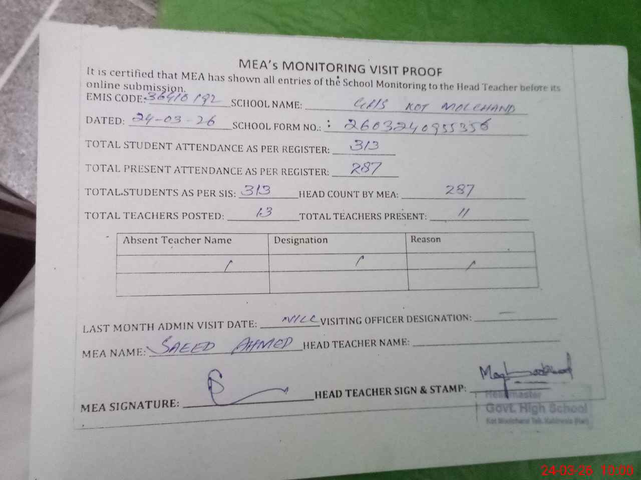 | Attendance Register | Head Teacher | MEA with School | Visit Proof |