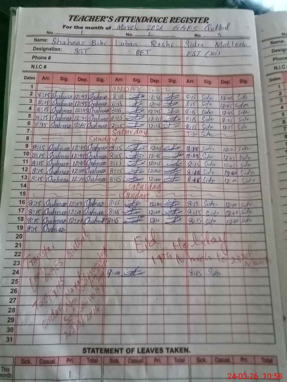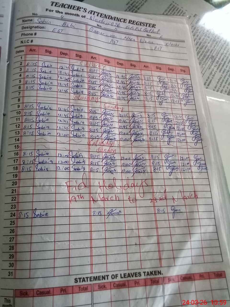 | Name: Sh**** BiBi Designation: (School Headmaster's/Headmistress's) SST G) Phone/Cell Number: 03**** |