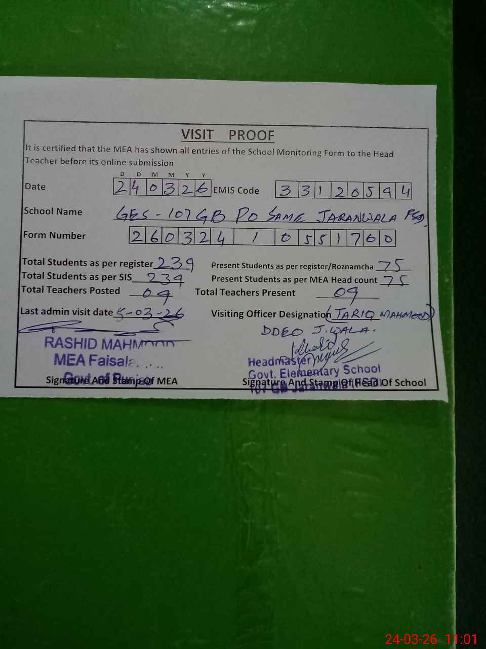 | Certified that this School was Inspected by the Undersigned MEA/DMO Today and the Information Stated Above is as Per Record. | |||||