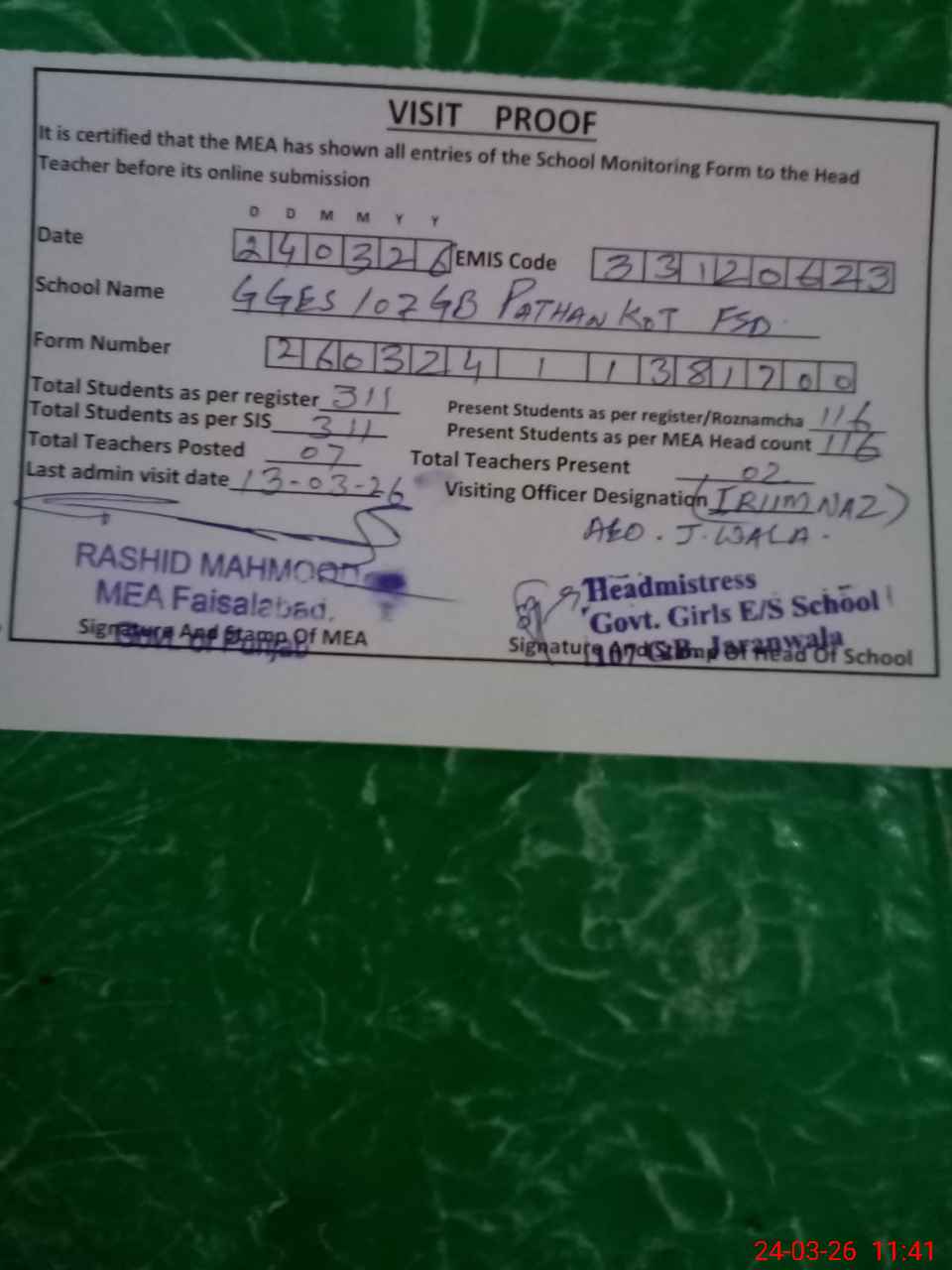 | Certified that this School was Inspected by the Undersigned MEA/DMO Today and the Information Stated Above is as Per Record. | |||||