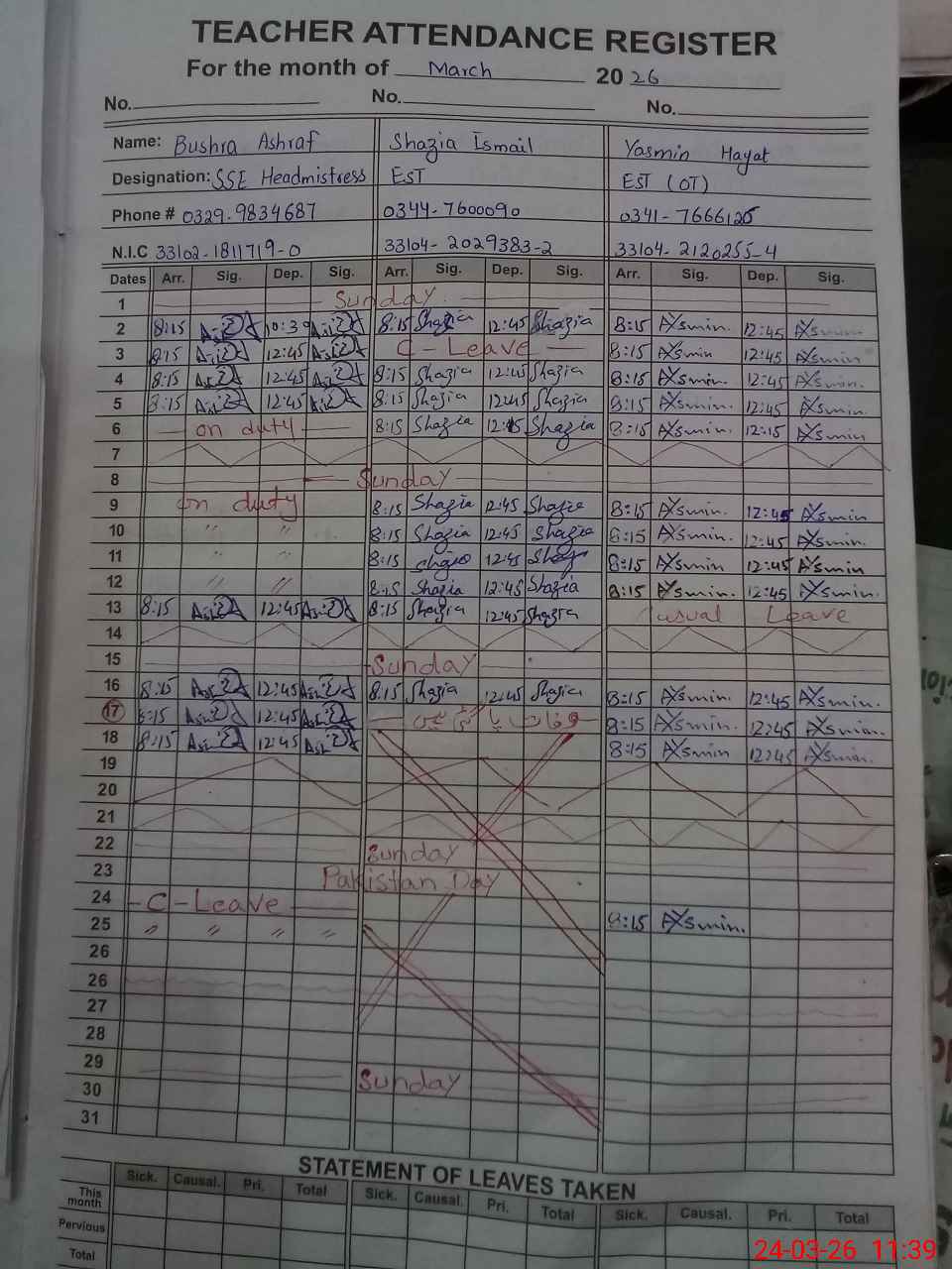 | 34**** | Ko**** Ma**** | PST Science/Maths | Regular | 0 | 0 | 0 | 0 | 0 | 0 | 0 | 0 | 0 | Absent (Un-Authorized) |