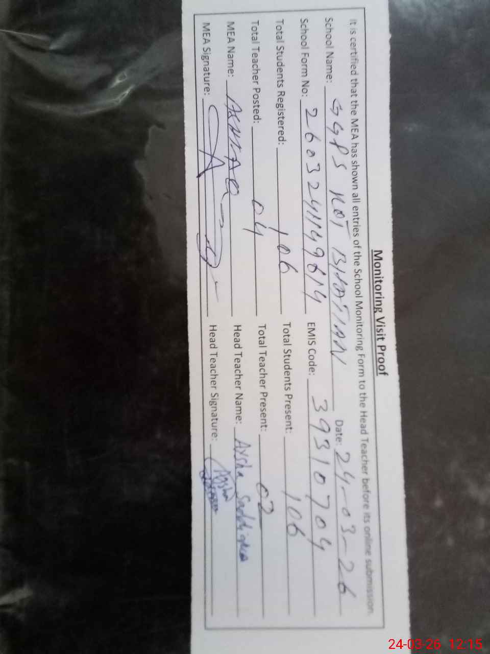 | Attendance Register | Head Teacher | MEA with School | Visit Proof |