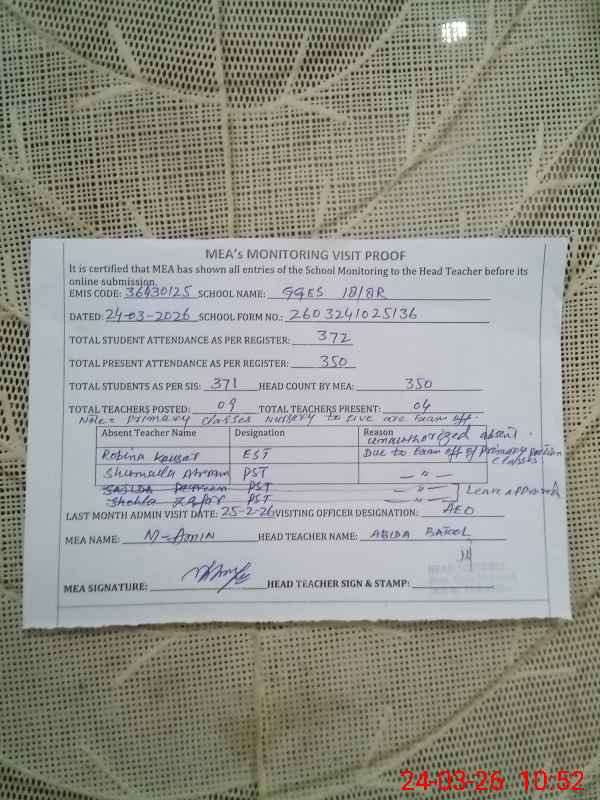| Remarks (Use Separate Page if Required): EST Robina kousar, PST Shumail Akram, are found absent. | |||||