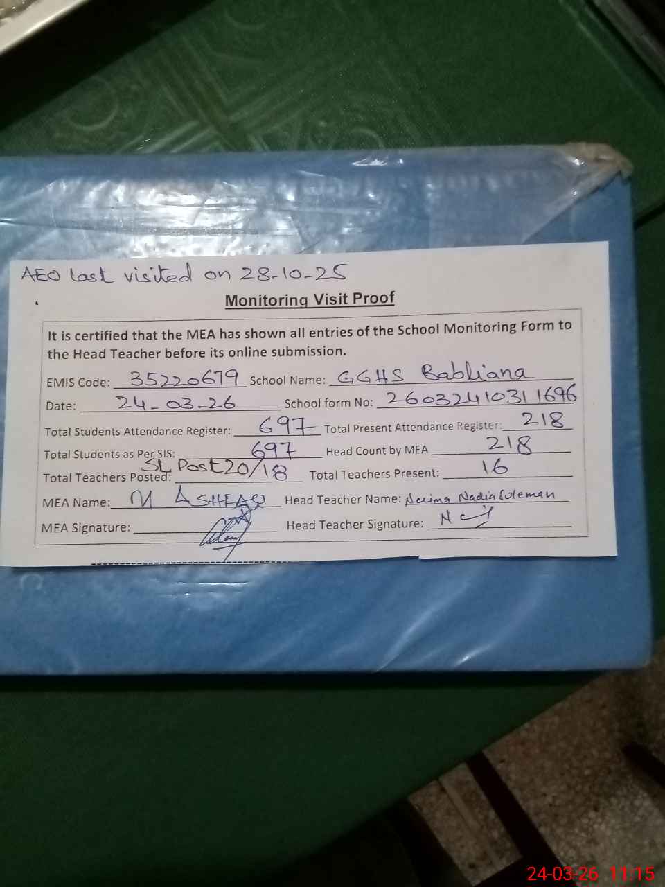 | Remarks (Use Separate Page if Required): PST Sarafoon Shamoon applied Maternity leave but her leave still not approved by DEO so mark him absent EST Kalsoom Ejaz applied Medical leave but her leave still not approved by DEO so mark him absent Classes ECE to 5th and Class 10th are on off today AEO Samreen visited on 28-10-2025 School has two campuses and total 30 rooms while 04 classrooms of Primary campus looking poor condition and also not in use 35220679 | |||||