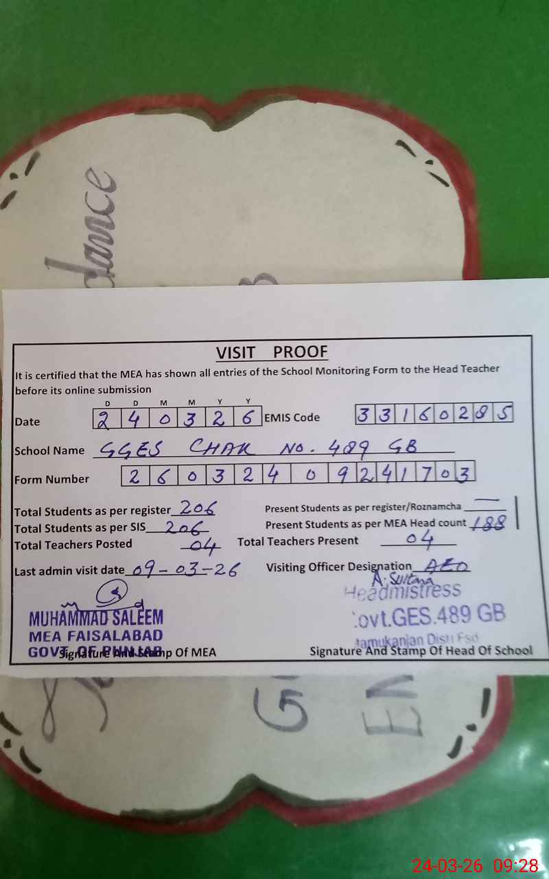 | EMIS Code: 33160285 | Name of School: GGES CHAK 489 GB MAMUNKANJAN | |||