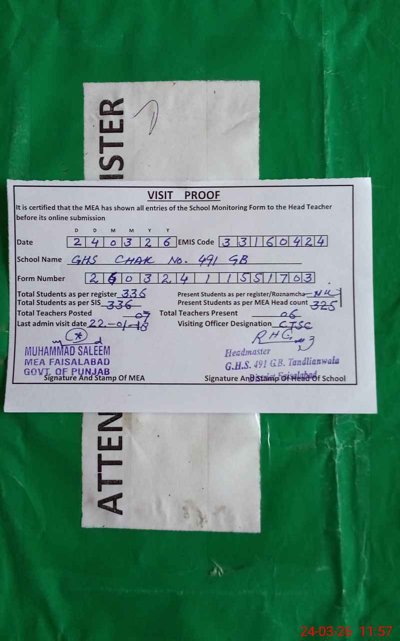 | EMIS Code: 33160424 | Name of School: GHS CHAK 491 GB TANDLIANWLA | |||