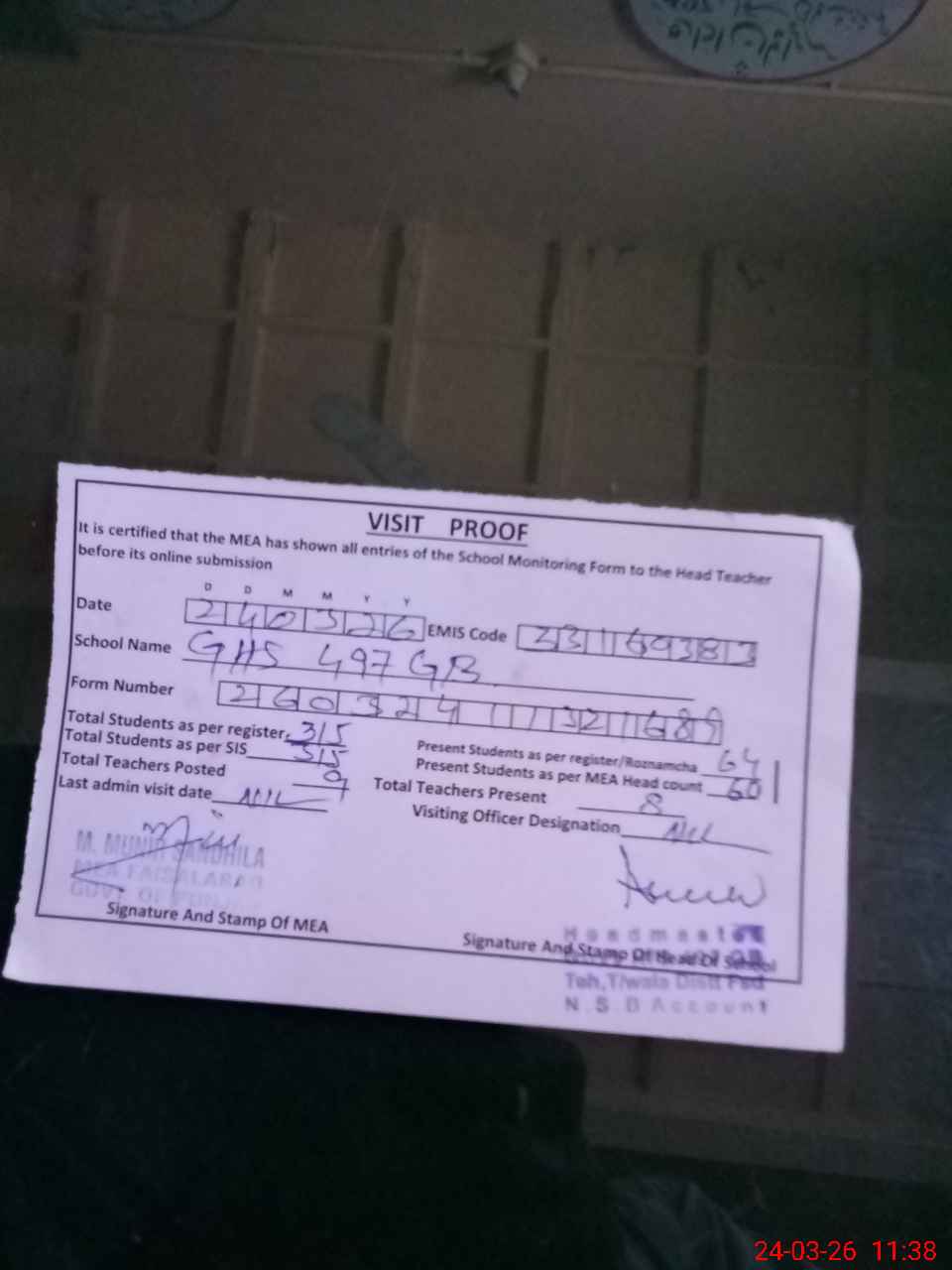 | Attendance Register | Head Teacher | MEA with School | Visit Proof |