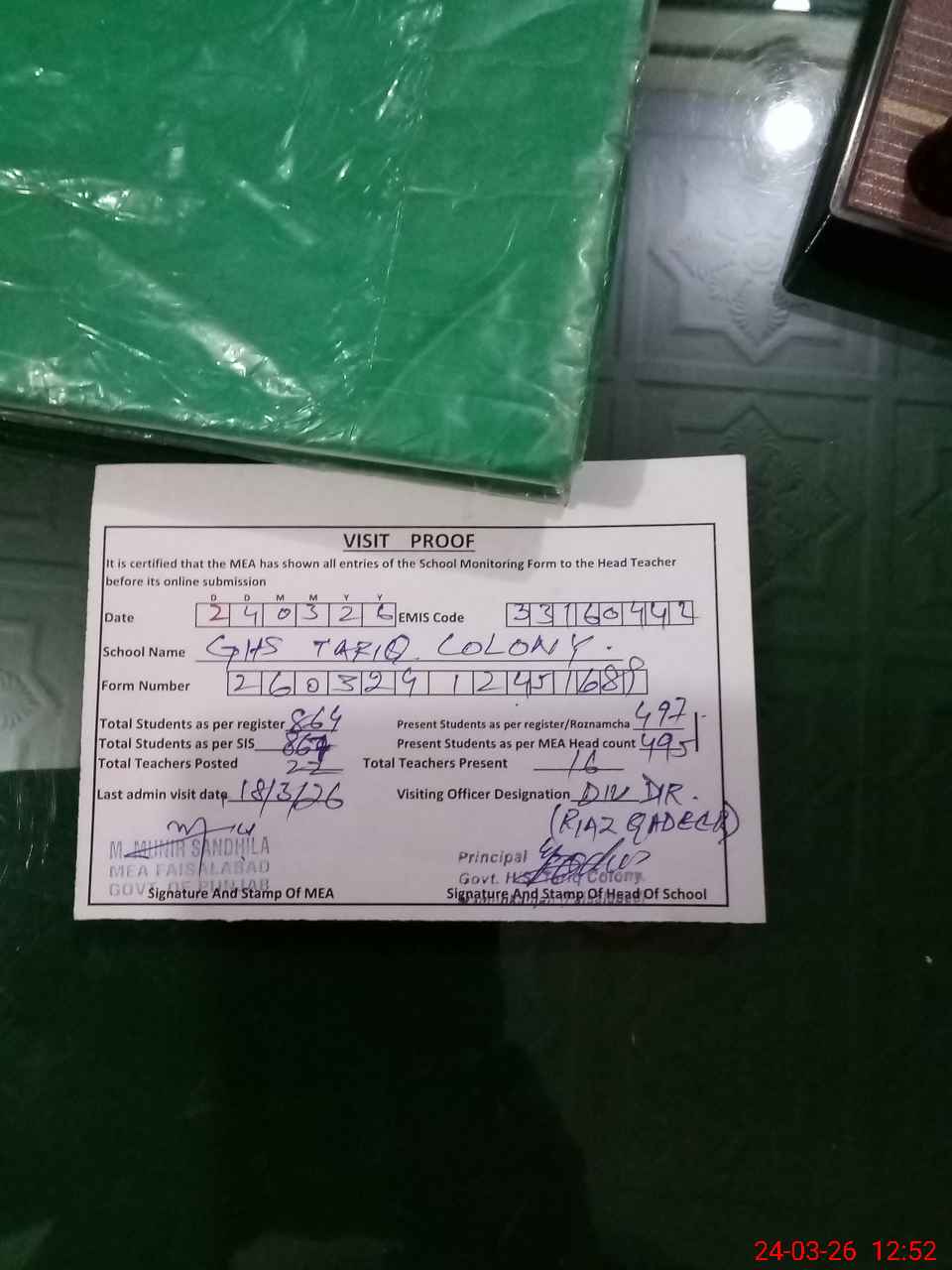 | Certified that this School was Inspected by the Undersigned MEA/DMO Today and the Information Stated Above is as Per Record. | |||||