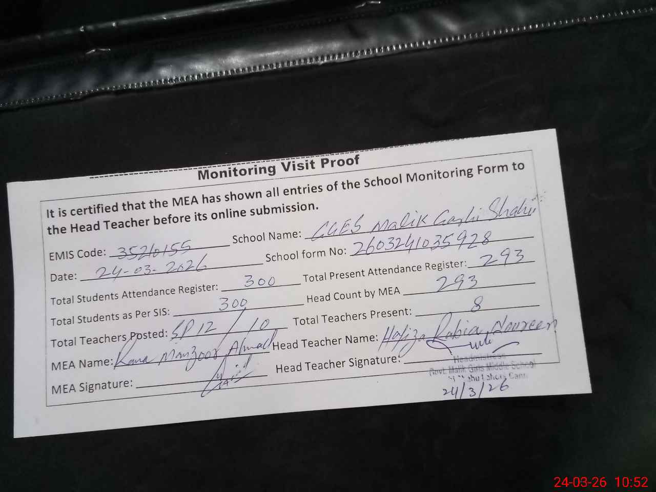 | Monitoring Date: 24-03-2026 | Start Time: 24-03-2026 10:19 AM | End Time: 24-03-2026 10:54 AM | Name of MEA: Ra**** Ma**** Ah**** | |