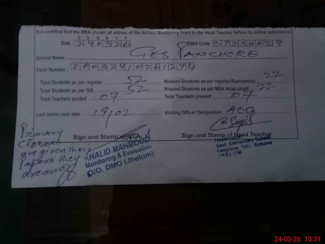 | Certified that this School was Inspected by the Undersigned MEA/DMO Today and the Information Stated Above is as Per Record. | |||||
