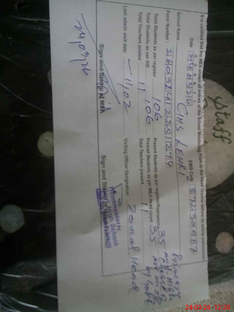 | Certified that this School was Inspected by the Undersigned MEA/DMO Today and the Information Stated Above is as Per Record. | |||||
