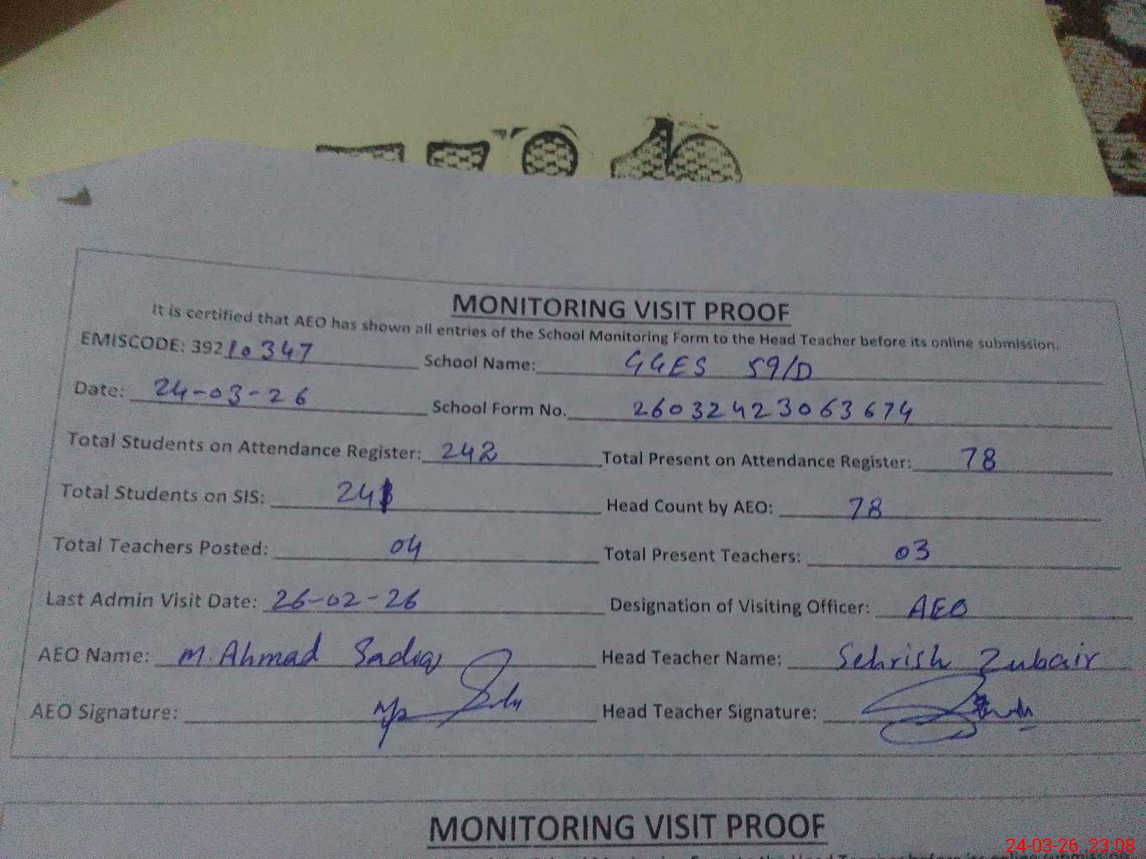 | Attendance Register | Head Teacher | MEA with School | Visit Proof |