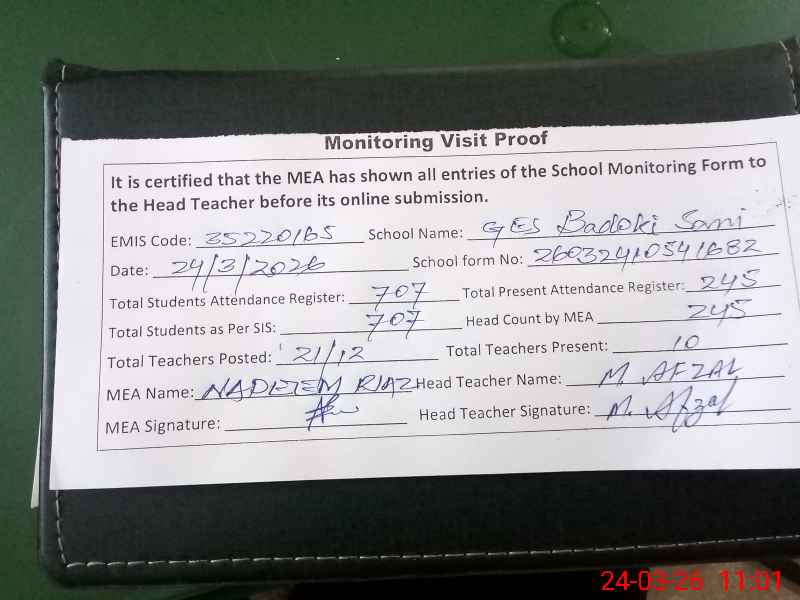| Certified that this School was Inspected by the Undersigned MEA/DMO Today and the Information Stated Above is as Per Record. | |||||