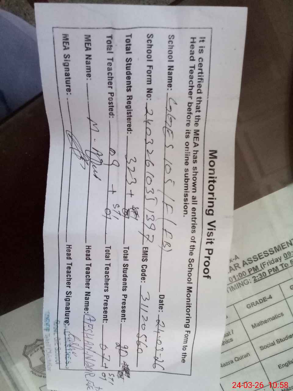 | Attendance Register | Head Teacher | MEA with School | Visit Proof |