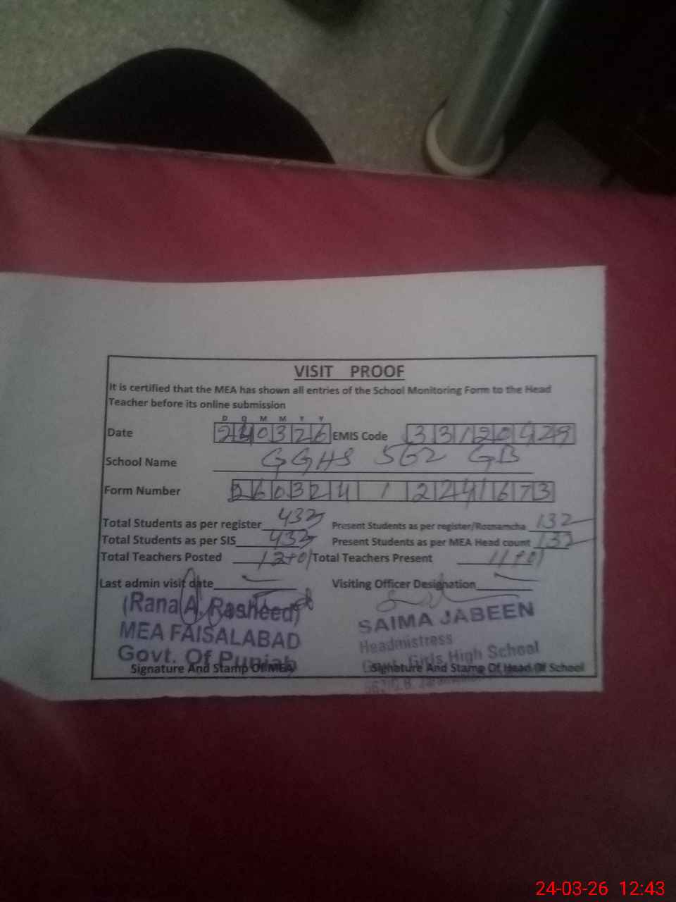 | Attendance Register | Head Teacher | MEA with School | Visit Proof |