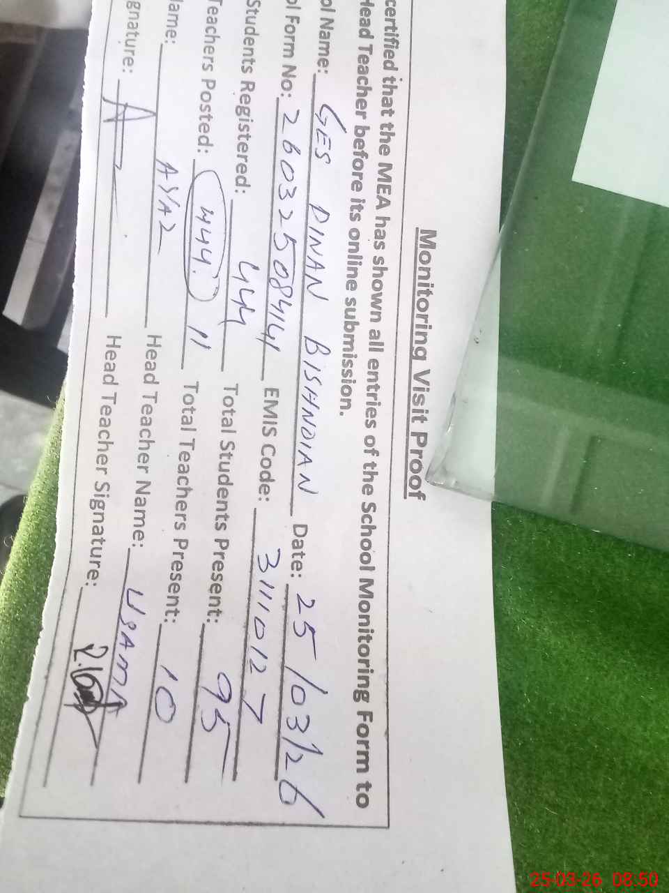 | Attendance Register | Head Teacher | MEA with School | Visit Proof |