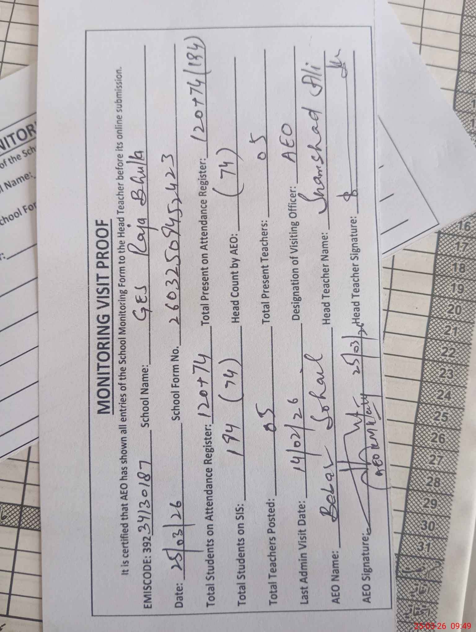 | Attendance Register | Head Teacher | MEA with School | Visit Proof |