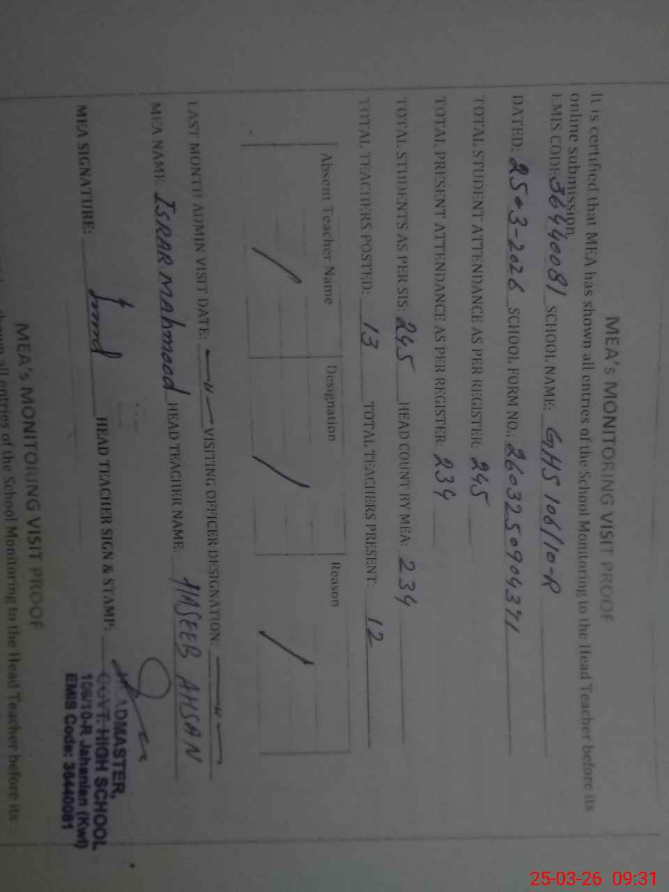 | EMIS Code: 36440081 | Name of School: GHS 106/10-R, JAHANIAN | |||