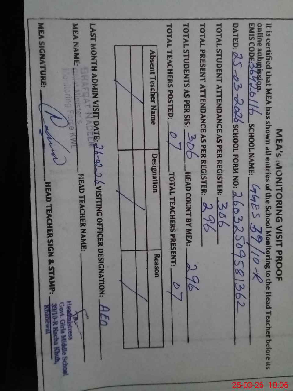 | Certified that this School was Inspected by the Undersigned MEA/DMO Today and the Information Stated Above is as Per Record. | |||||