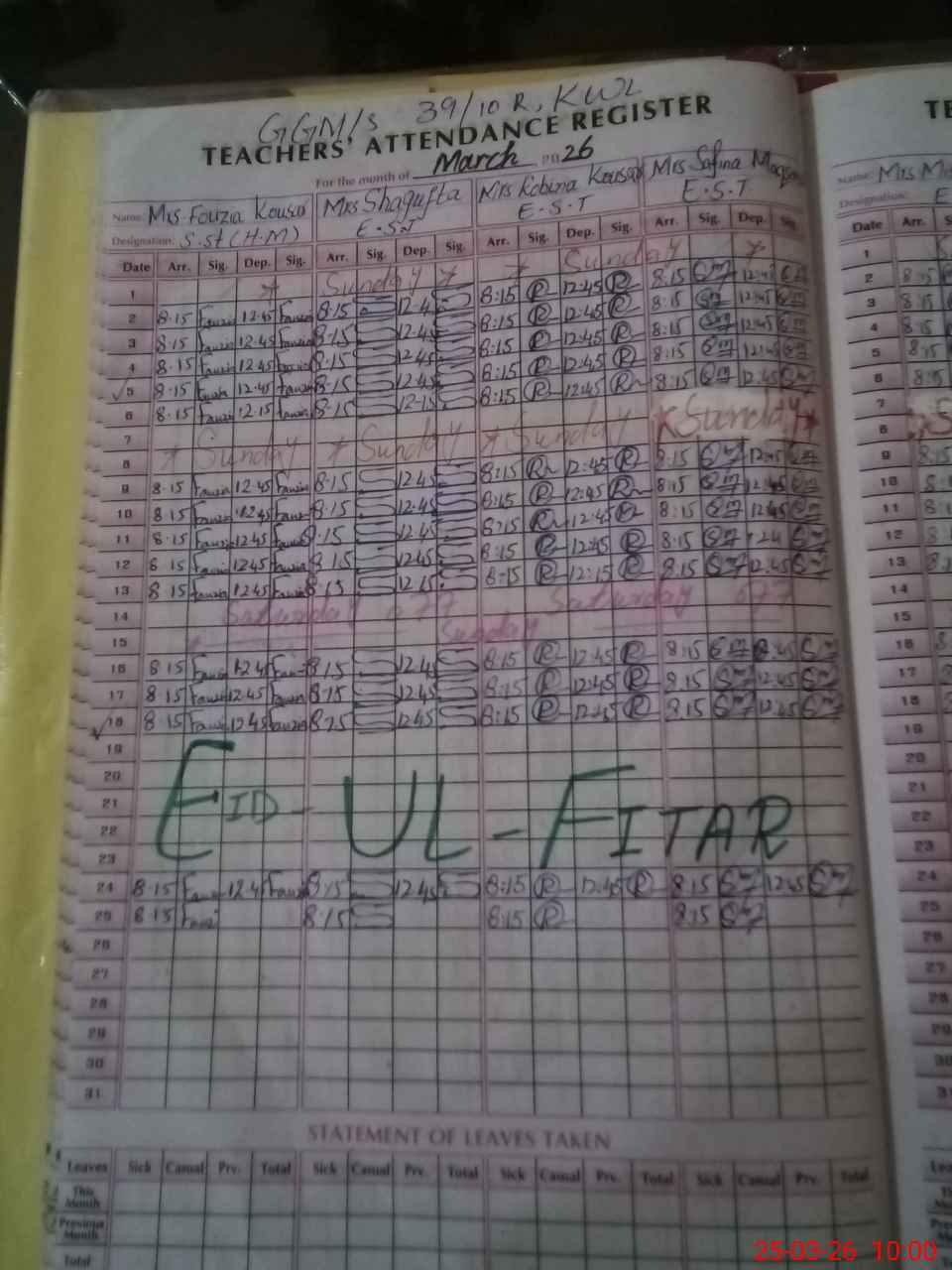 | Leave | Duty | Absent | Maternity | Medical | Ex- Pak |