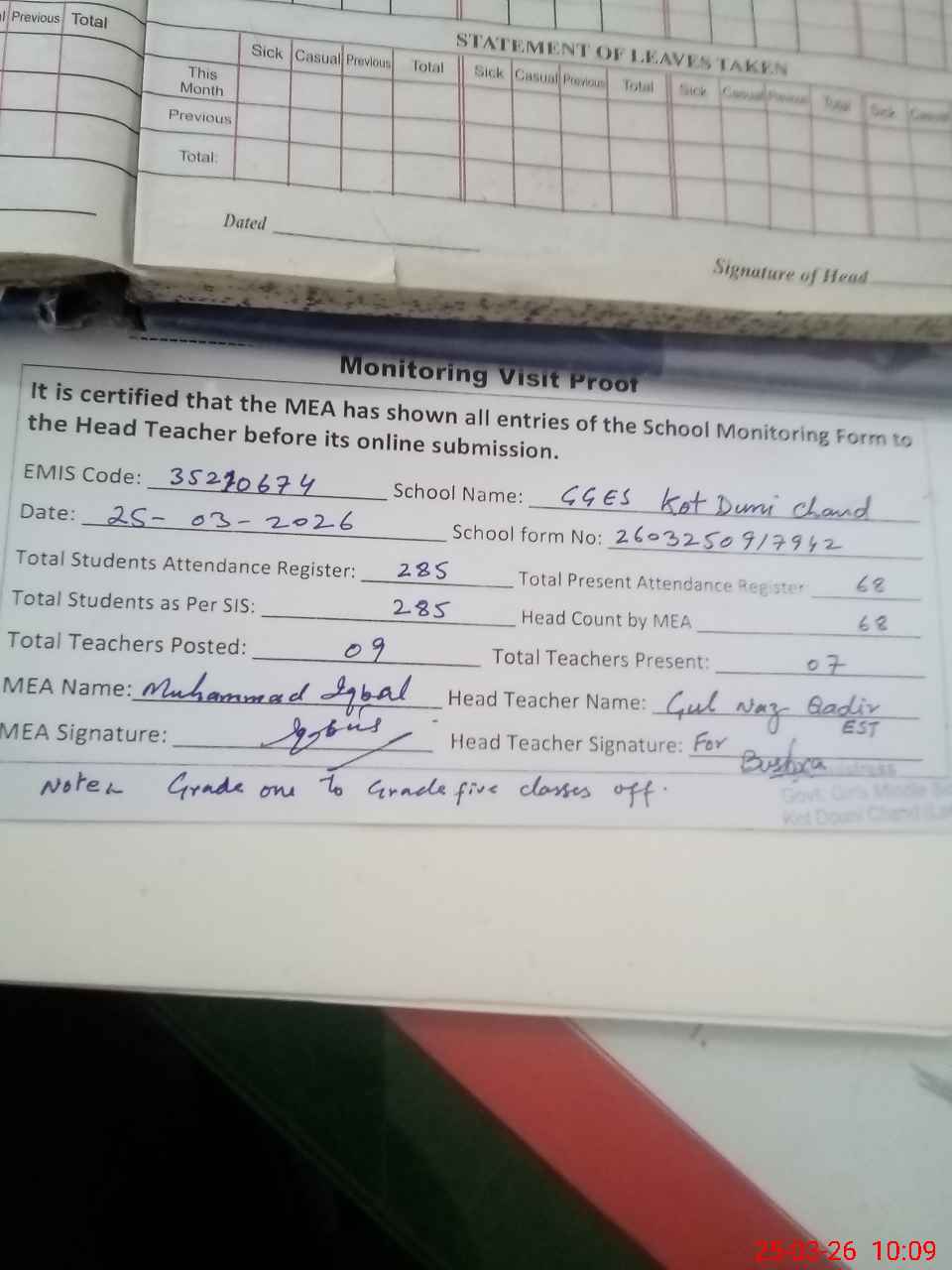 | Attendance Register | Head Teacher | MEA with School | Visit Proof |