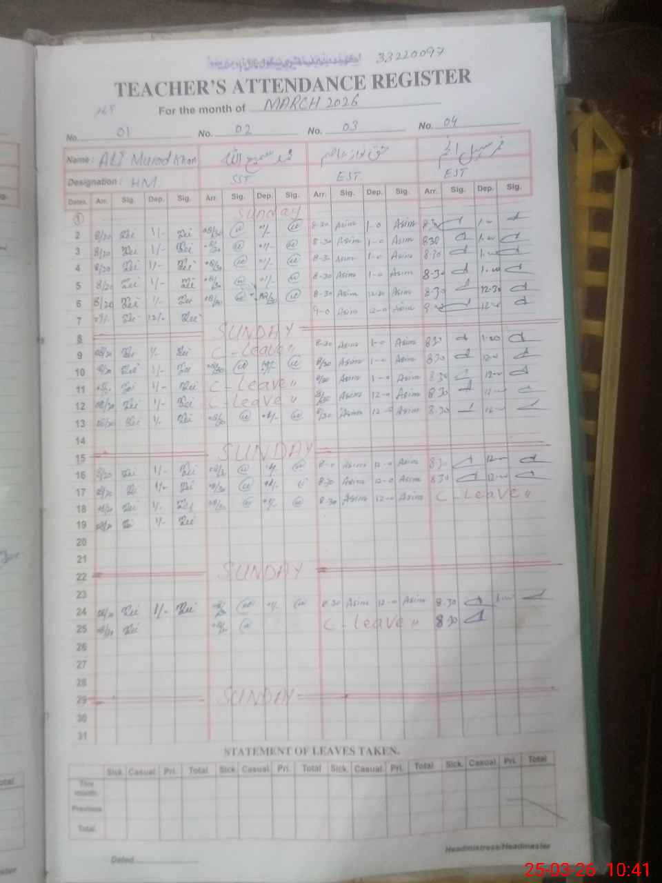 | Name: Al**** Mu**** Kh**** Designation: (School Headmaster's/Headmistress's) EST (HM) Phone/Cell Number: 03**** |