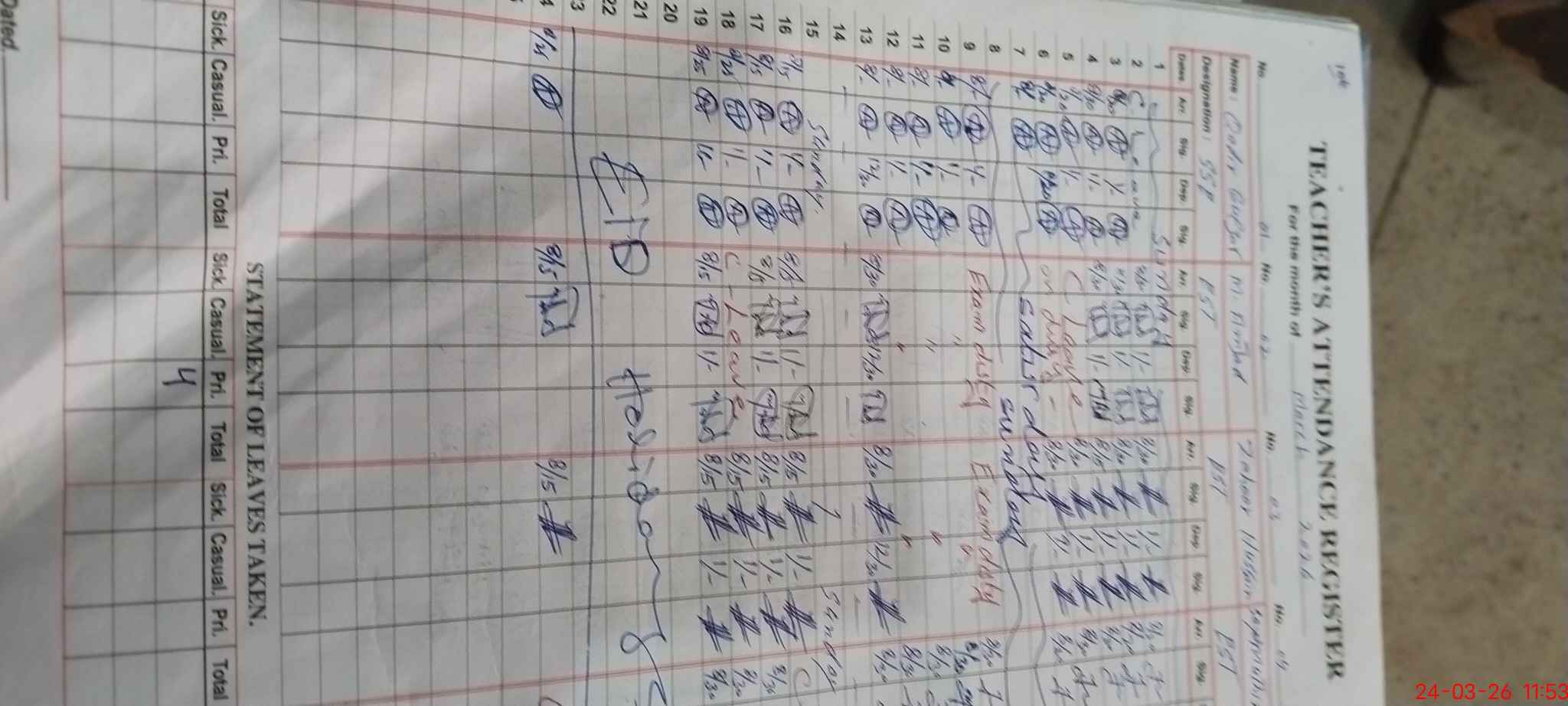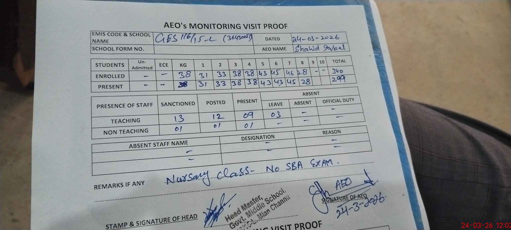 | Remarks (Use Separate Page if Required): Nursary class is absent because of holidays declared by punjab govt. | |||||