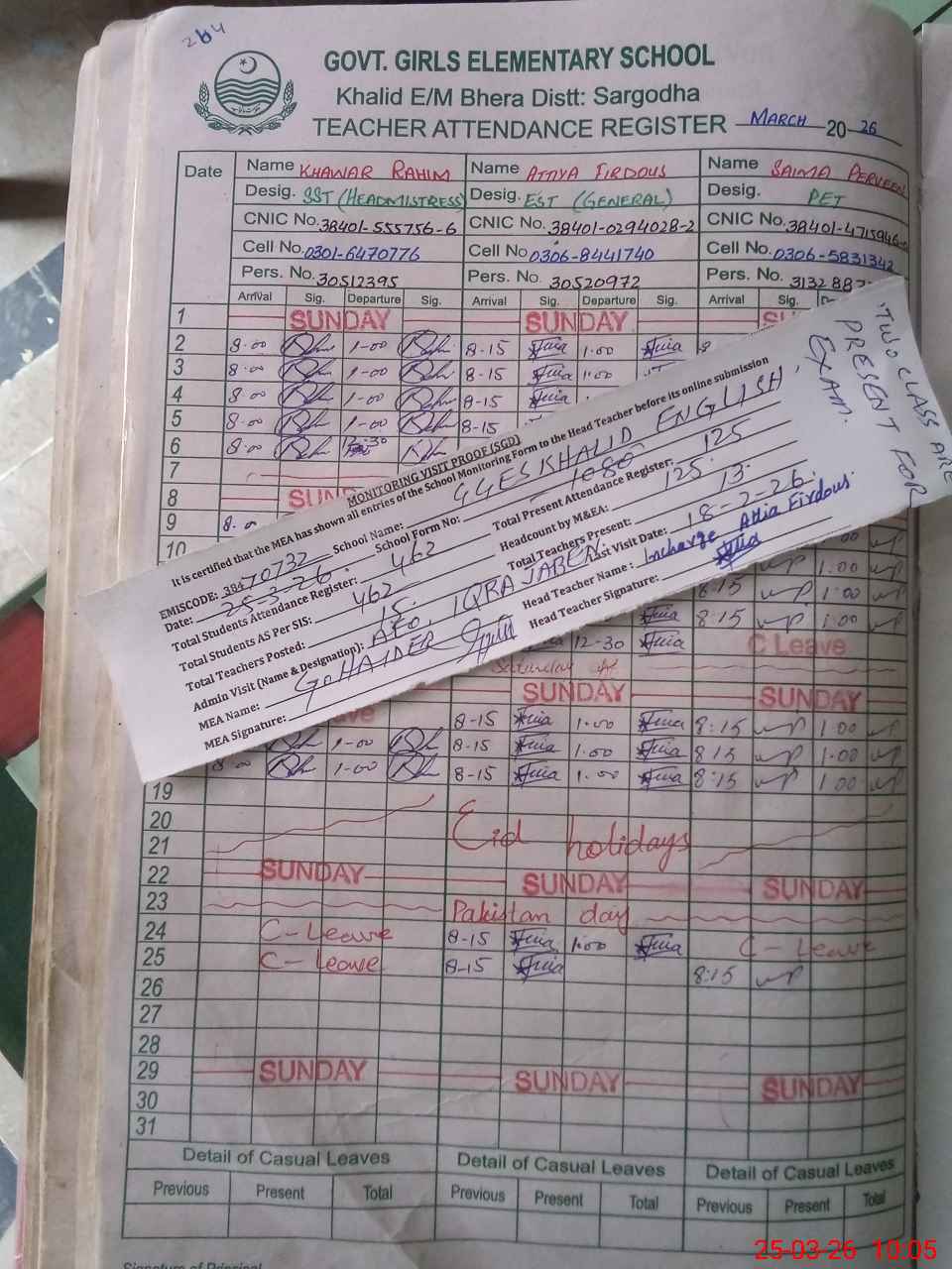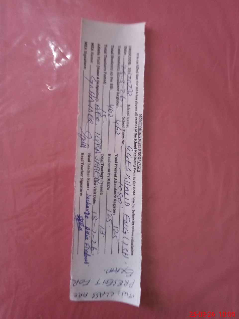 | Attendance Register | Head Teacher | MEA with School | Visit Proof |