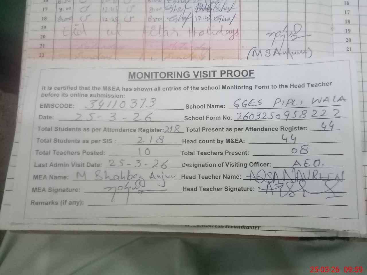| Monitoring Date: 25-03-2026 | Start Time: 25-03-2026 08:50 AM | End Time: 25-03-2026 10:02 AM | Name of MEA: S-**** Sh**** An**** | |