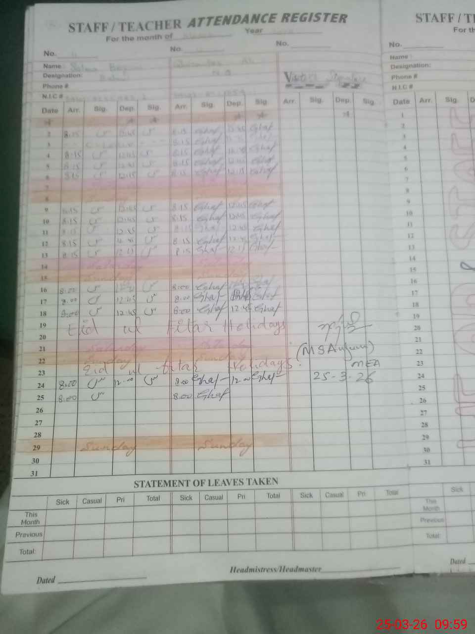 | Name: AQ**** NO**** Designation: (School Headmaster's/Headmistress's) S.S.T.(GEN) Phone/Cell Number: 03**** |