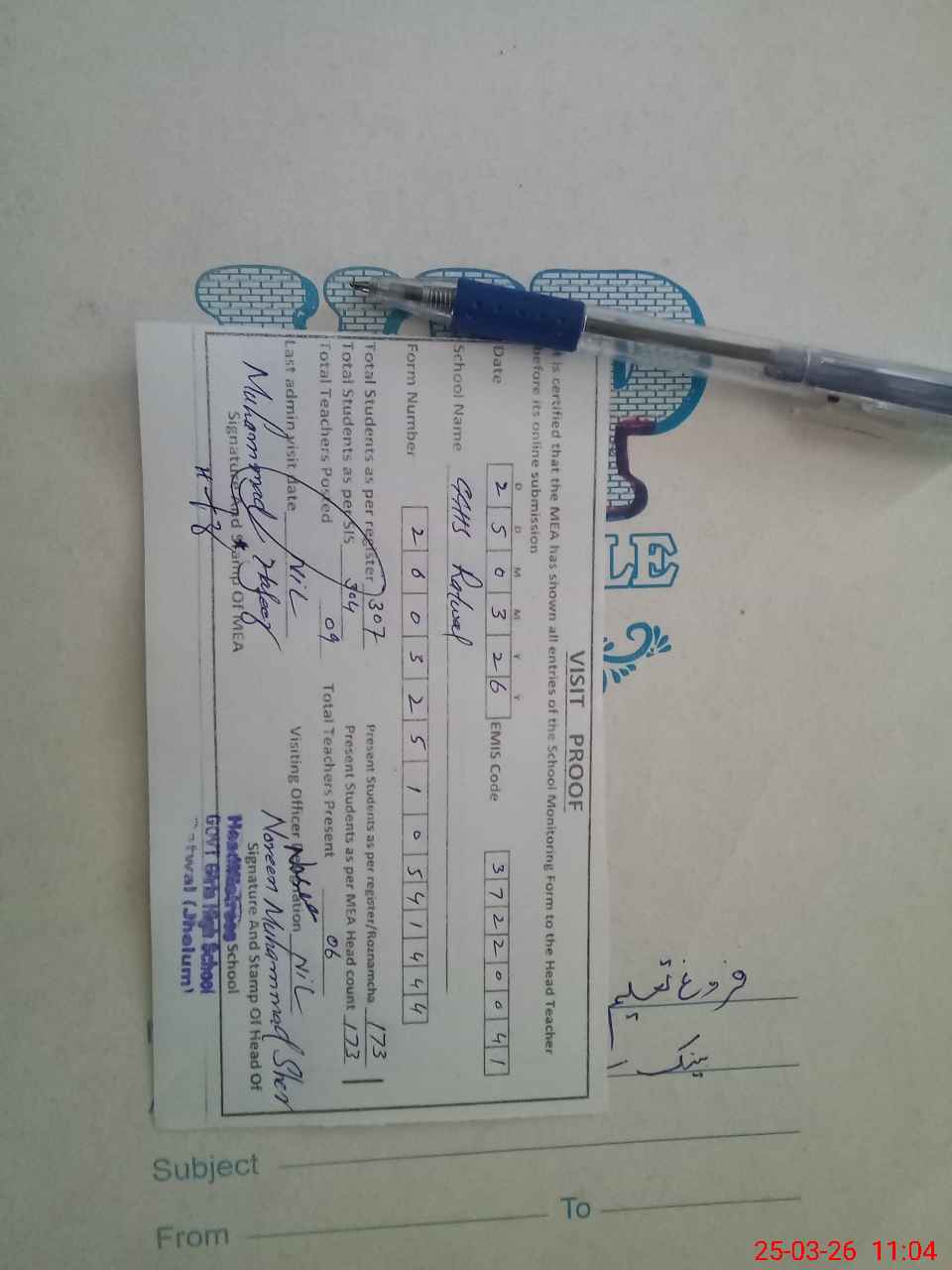 | Attendance Register | Head Teacher | MEA with School | Visit Proof |