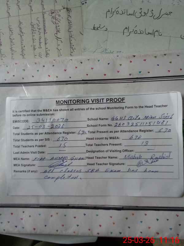 | EMIS Code: 34110070 | Name of School: GGHS QILA MIAN SINGH | |||