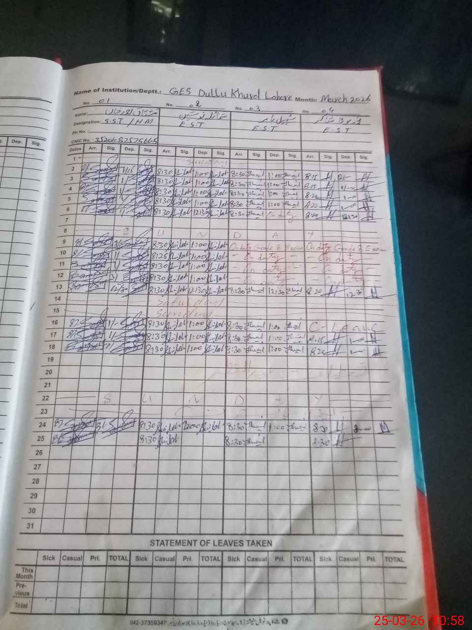 | CNIC | Full Name | Designation | R/C | Absence During Last Calender Month |