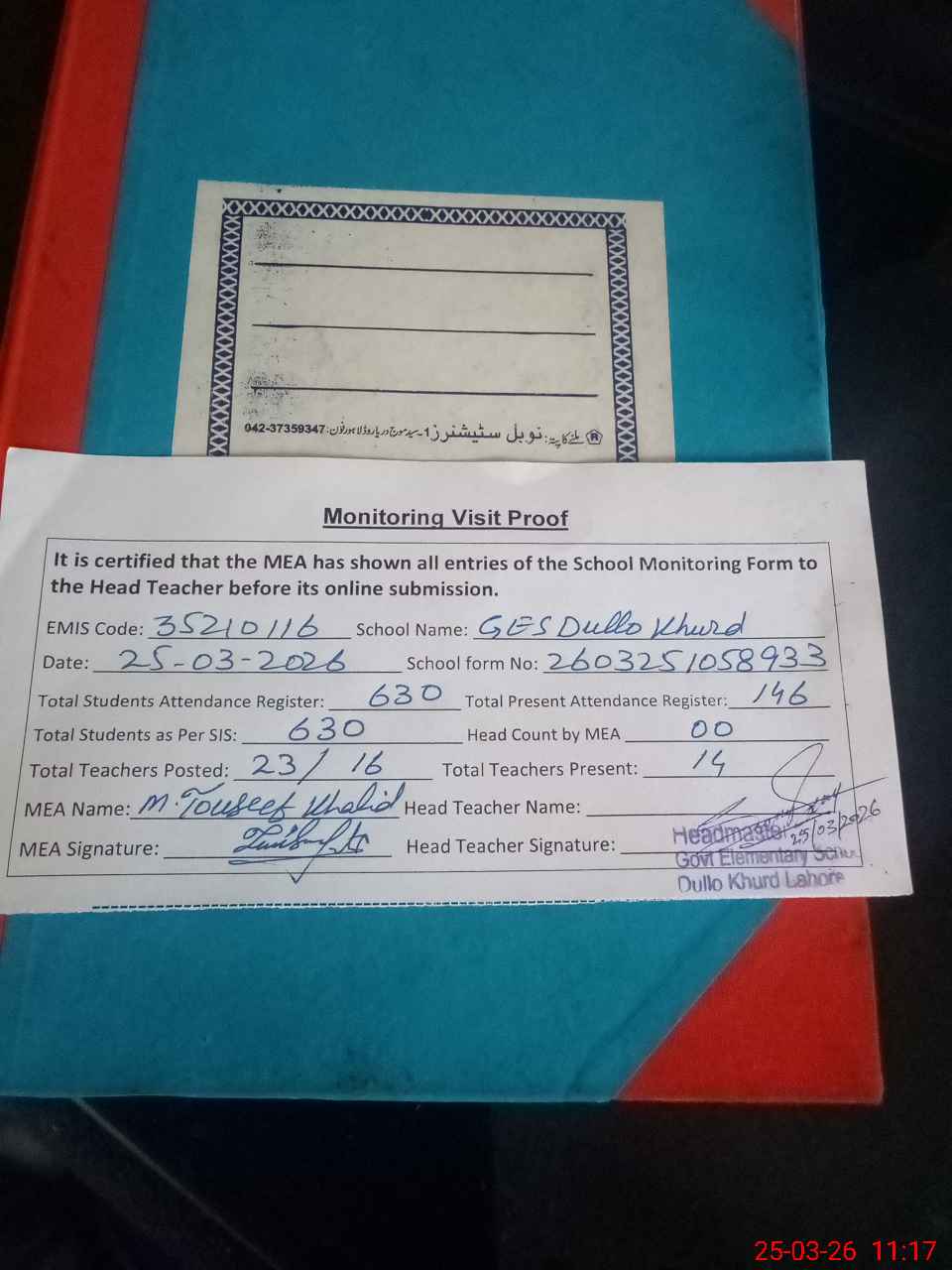 | Attendance Register | Head Teacher | MEA with School | Visit Proof |