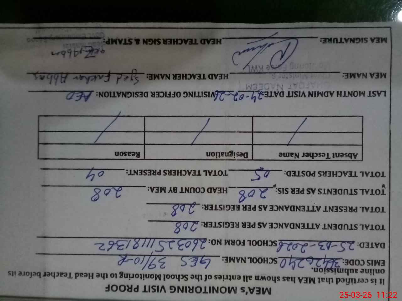 | Attendance Register | Head Teacher | MEA with School | Visit Proof |