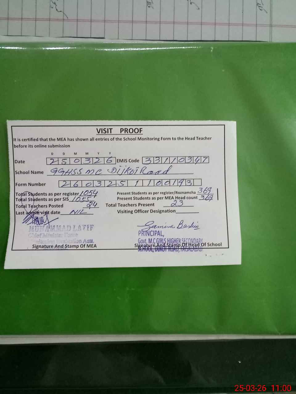 | Attendance Register | Head Teacher | MEA with School | Visit Proof |