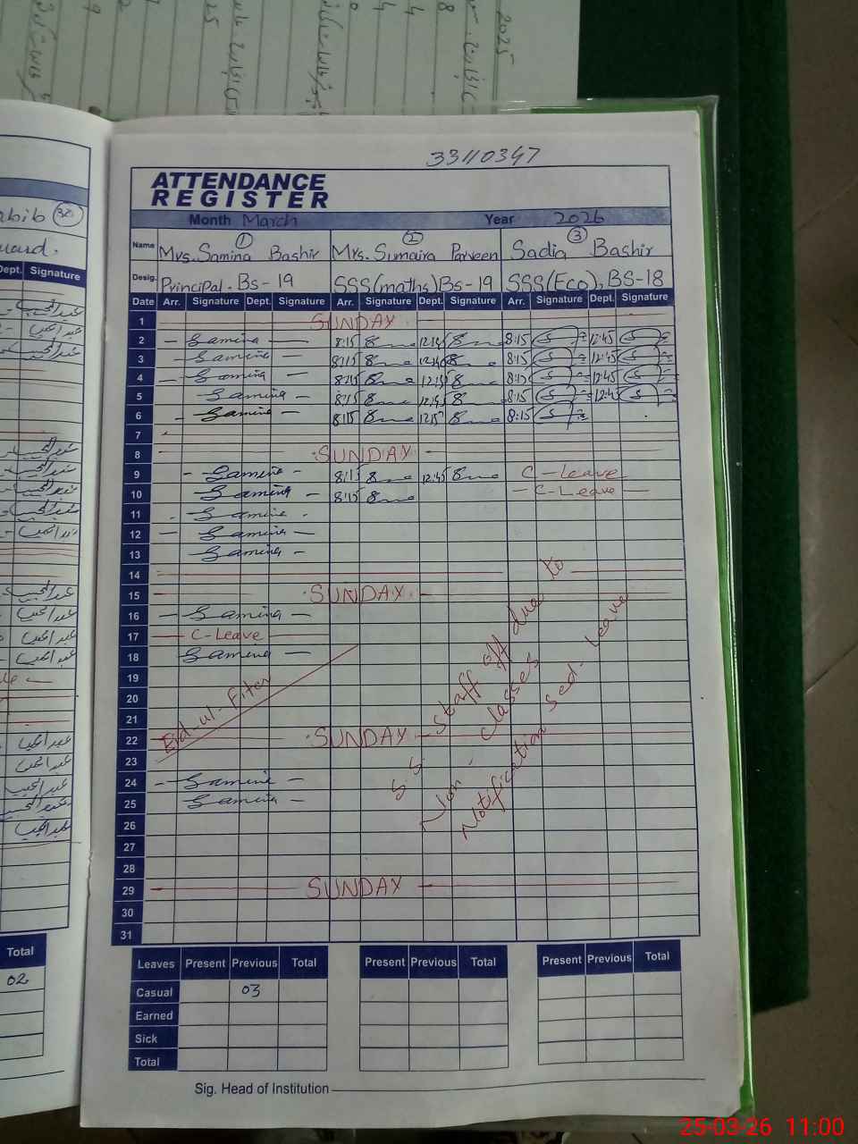 | CNIC | Full Name | Designation | R/C | Absence During Last Calender Month |