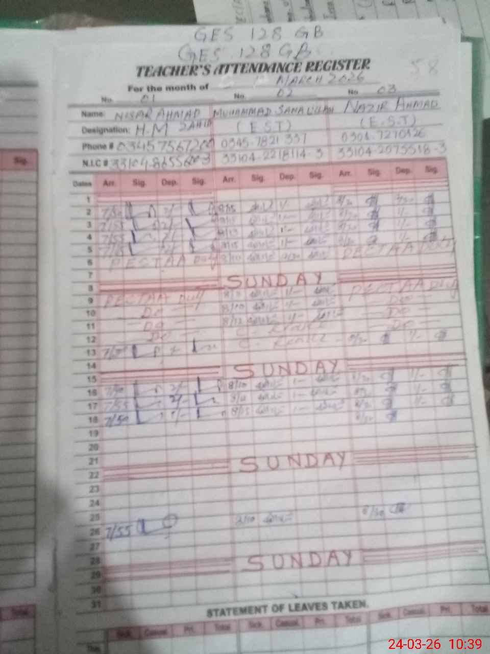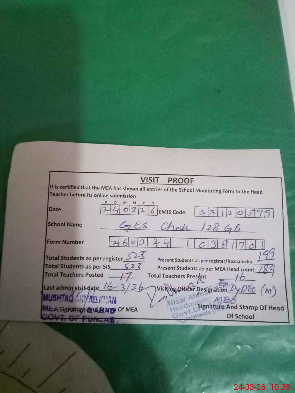 | EMIS Code: 33120599 | Name of School: GES CHAK 128GB JARANWALA | |||