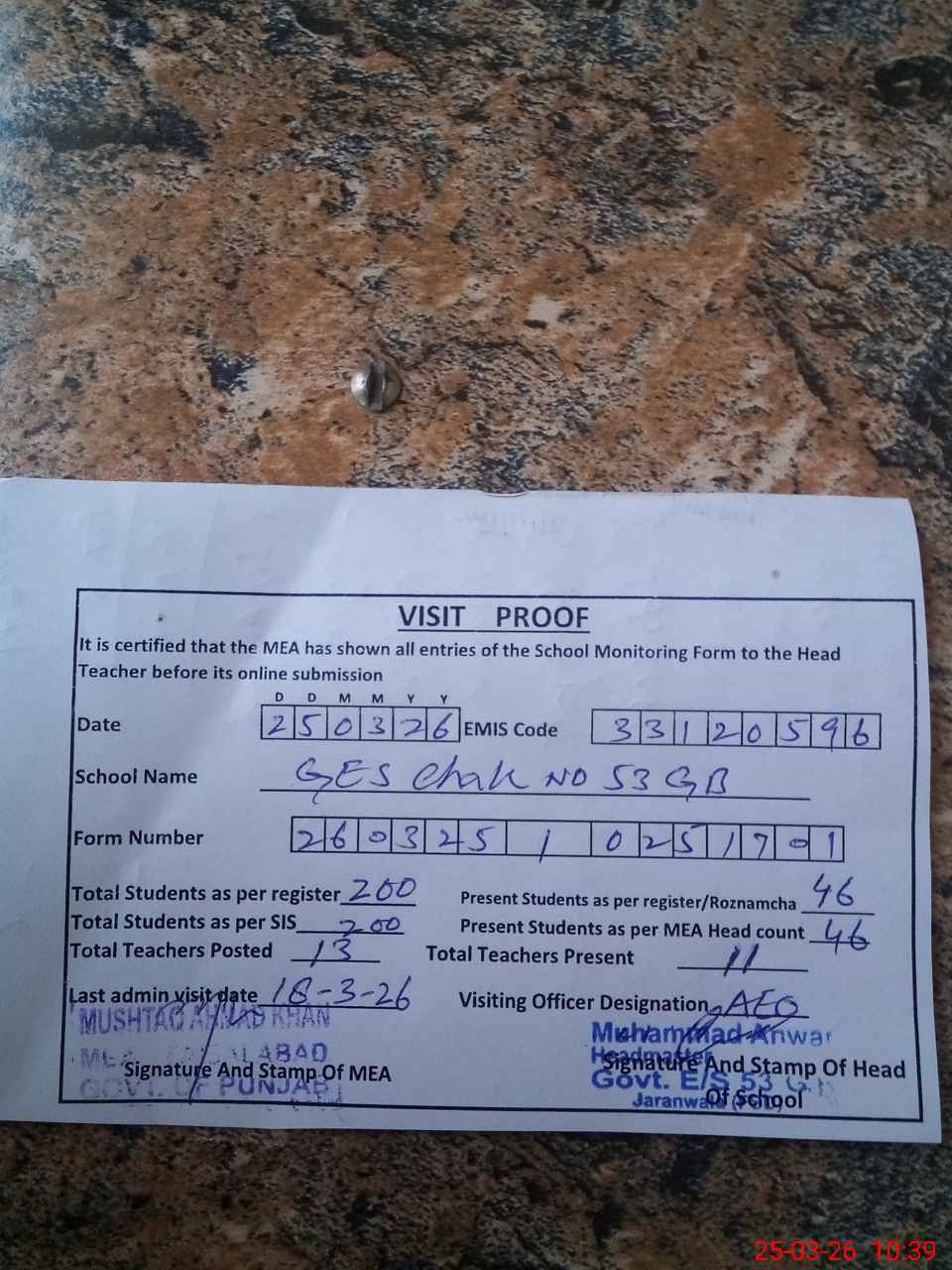 | EMIS Code: 33120596 | Name of School: GES CHAK NO.53 GB JARANWALA | |||