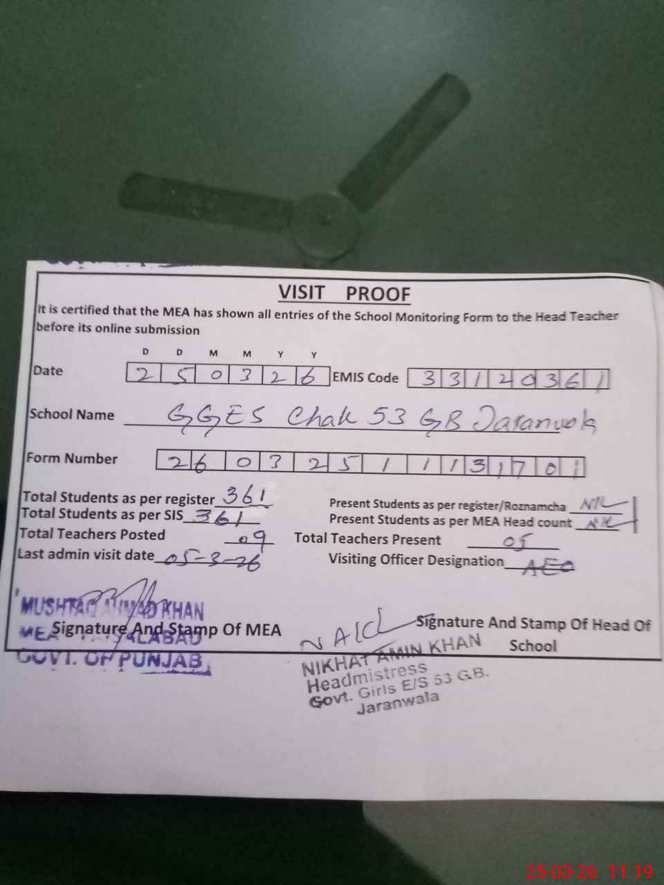 | EMIS Code: 33120361 | Name of School: GGES CHAK 53 GB JARANWALA | |||