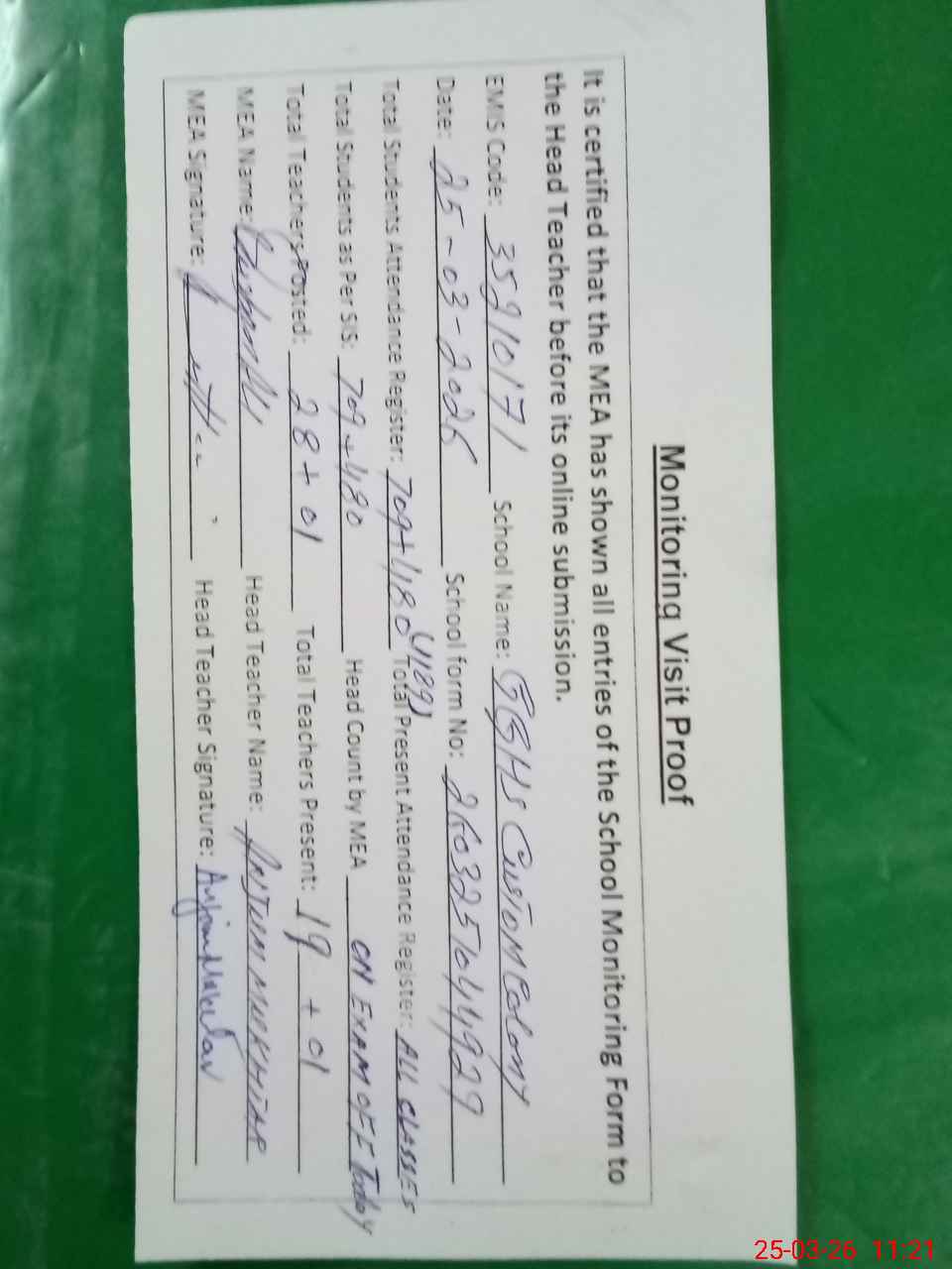| Attendance Register | Head Teacher | MEA with School | Visit Proof |