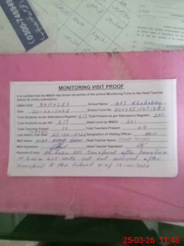 | Remarks (Use Separate Page if Required): Ali Raza SST has been transferred after demotion Muhammad Qasim EST Math yet not arrived after transferred to this School w e f 14 February, 2026 Reading exam of Class 6, 7 and 8 is carried out today Data as per provided by School Staff and found during physical visit | |||||