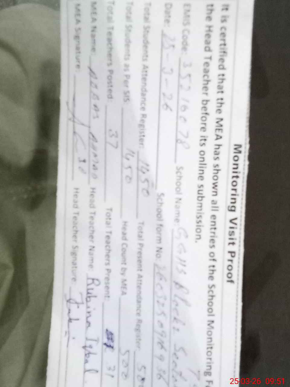 | Attendance Register | Head Teacher | MEA with School | Visit Proof |