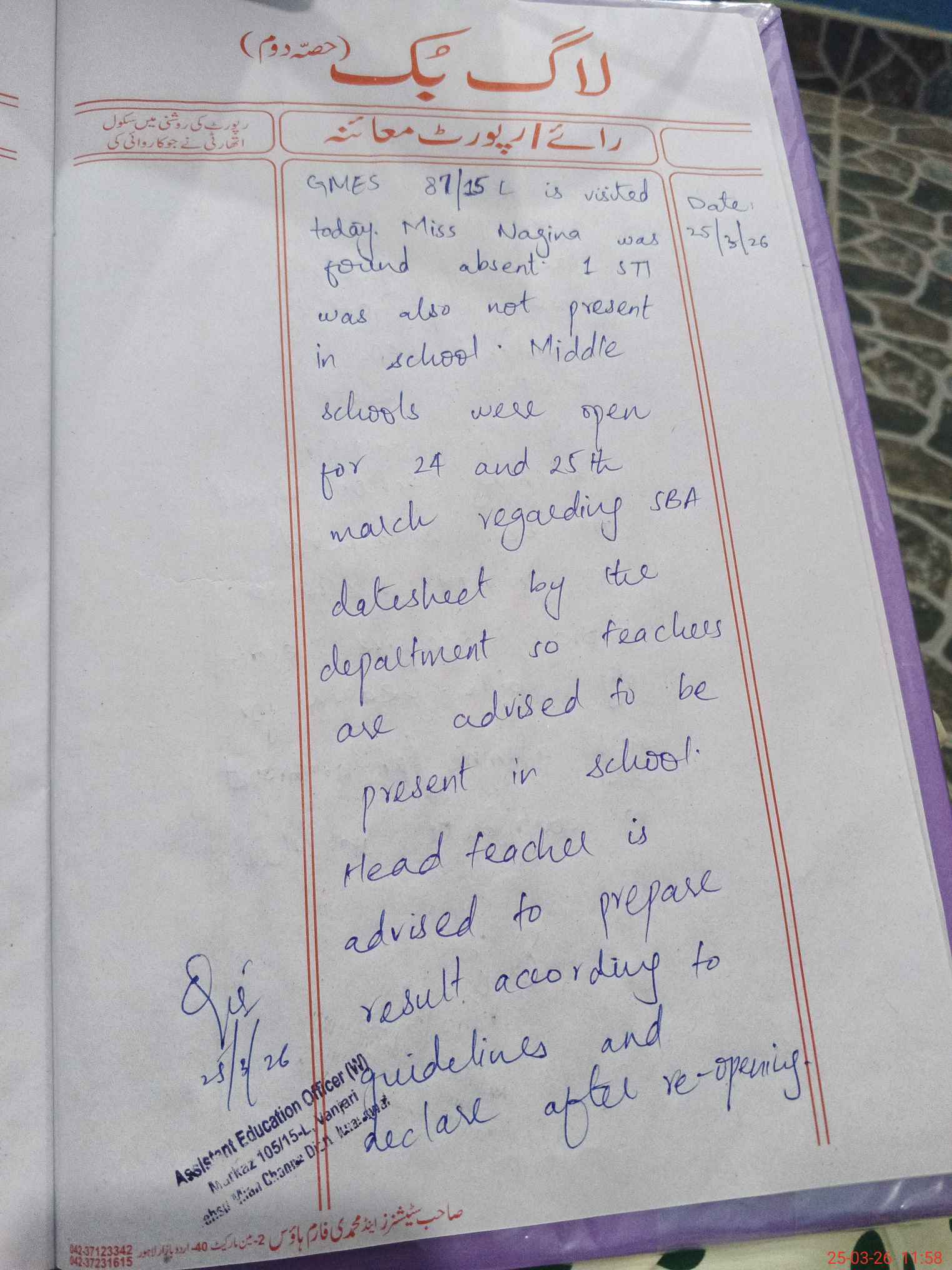 | Name: Mo**** Bi**** Designation: (School Headmaster's/Headmistress's) EST Phone/Cell Number: 03**** |