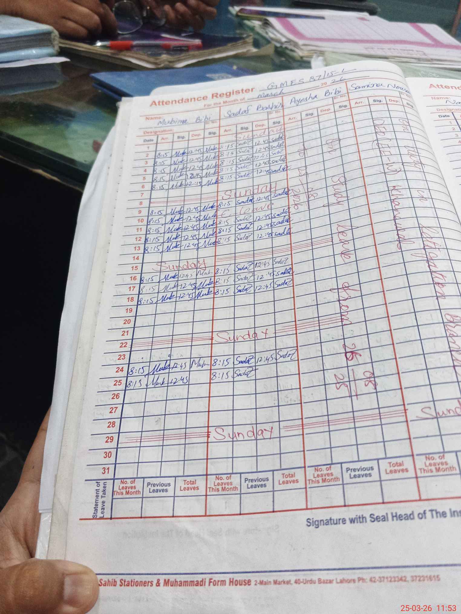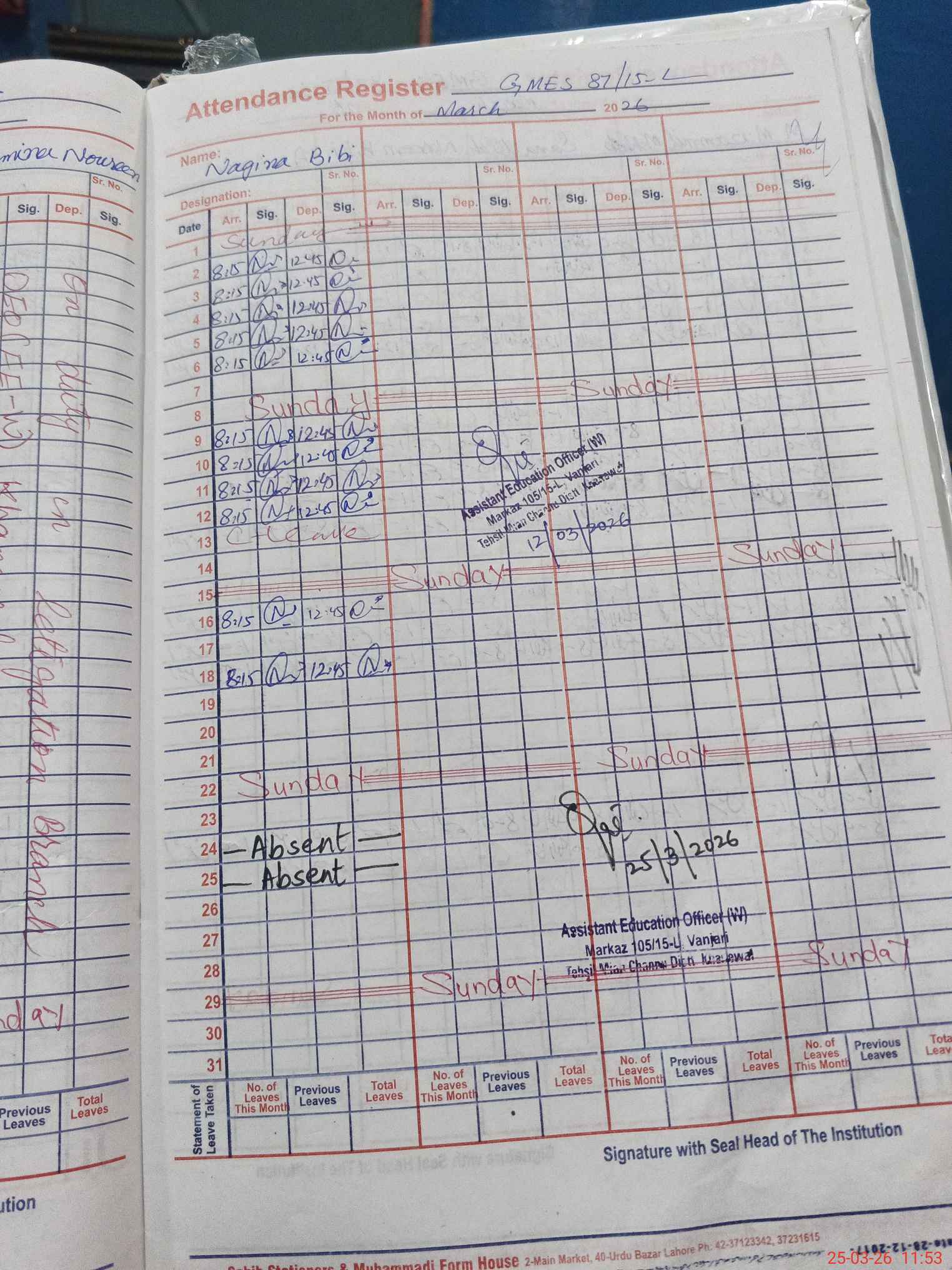 | CNIC | Full Name | Designation | R/C | Absence During Last Calender Month |