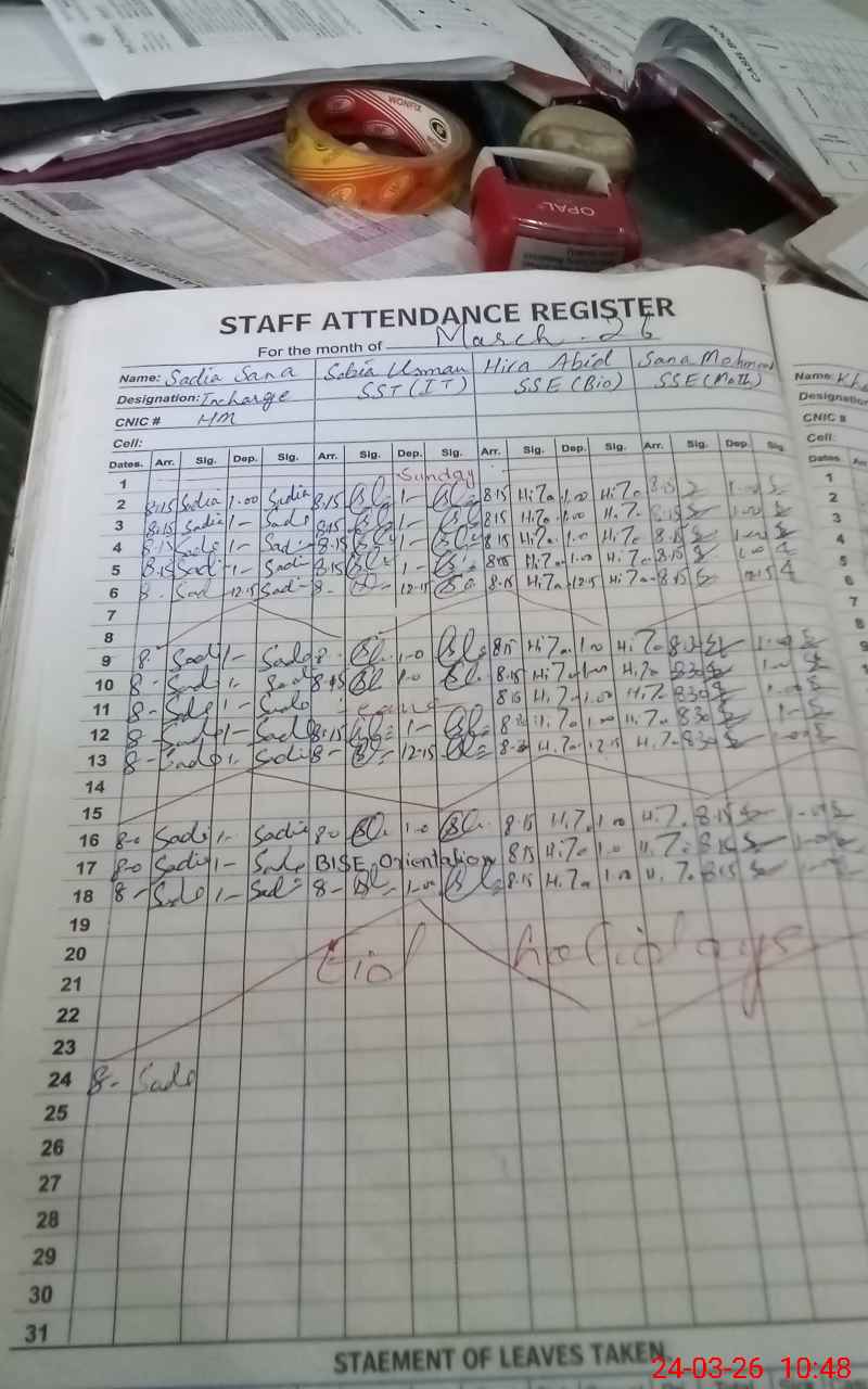 | Remarks (Use Separate Page if Required): 13 teachers were absent due to leave record was not available ECE, NURSERY,1,2,3,4,5,9 and 10th class on off 06 wash rooms were non-functional due to water Leakage Having 02 Sweepers, cleaning of wash rooms and classes was poor. | |||||