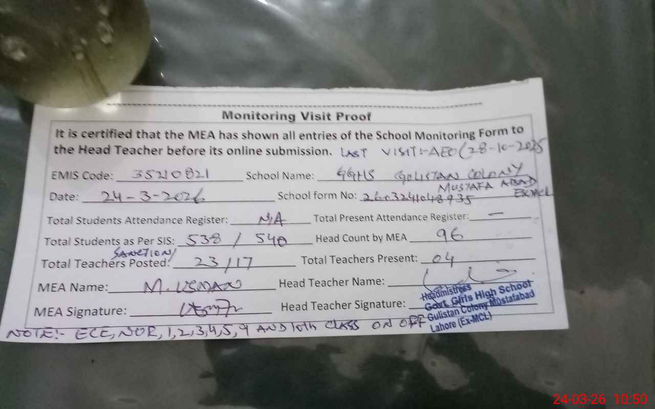 | EMIS Code: 35210821 | Name of School: GGHS GULISTAN COLONY MUSTAFA ABAD (EX-MCL) | |||