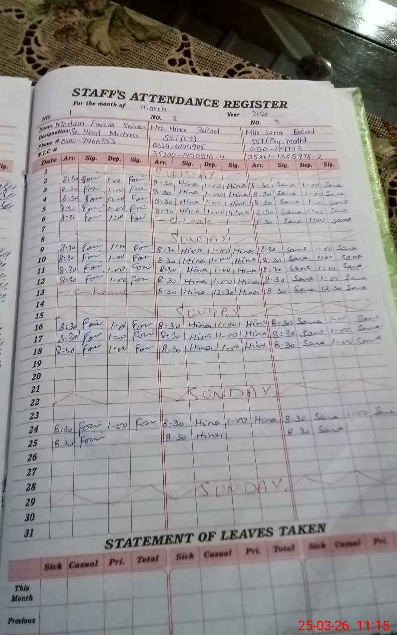 | Name: Fo**** Su**** Designation: (School Headmaster's/Headmistress's) Senior Head Mistress Phone/Cell Number: 03**** |