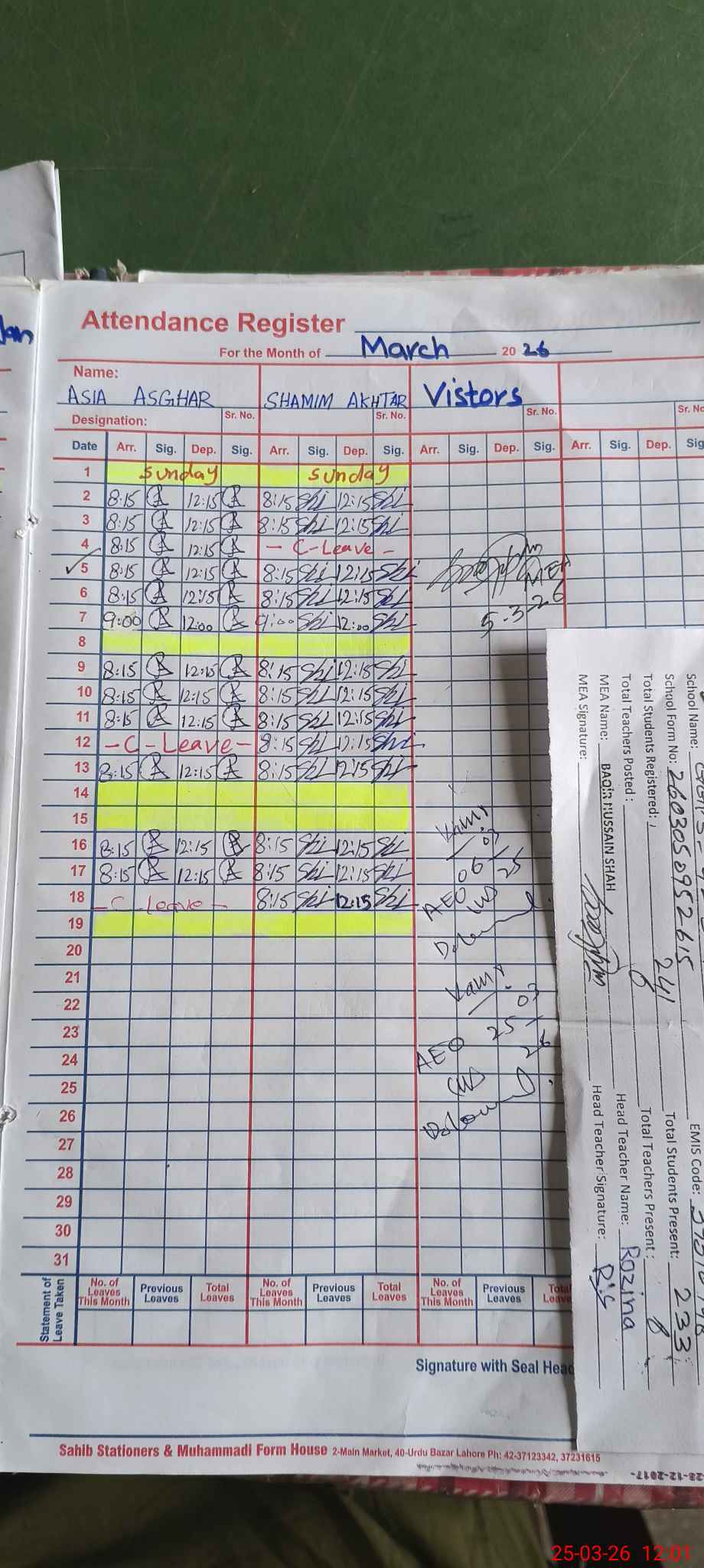 | Attendance Register | Head Teacher | MEA with School | Visit Proof |