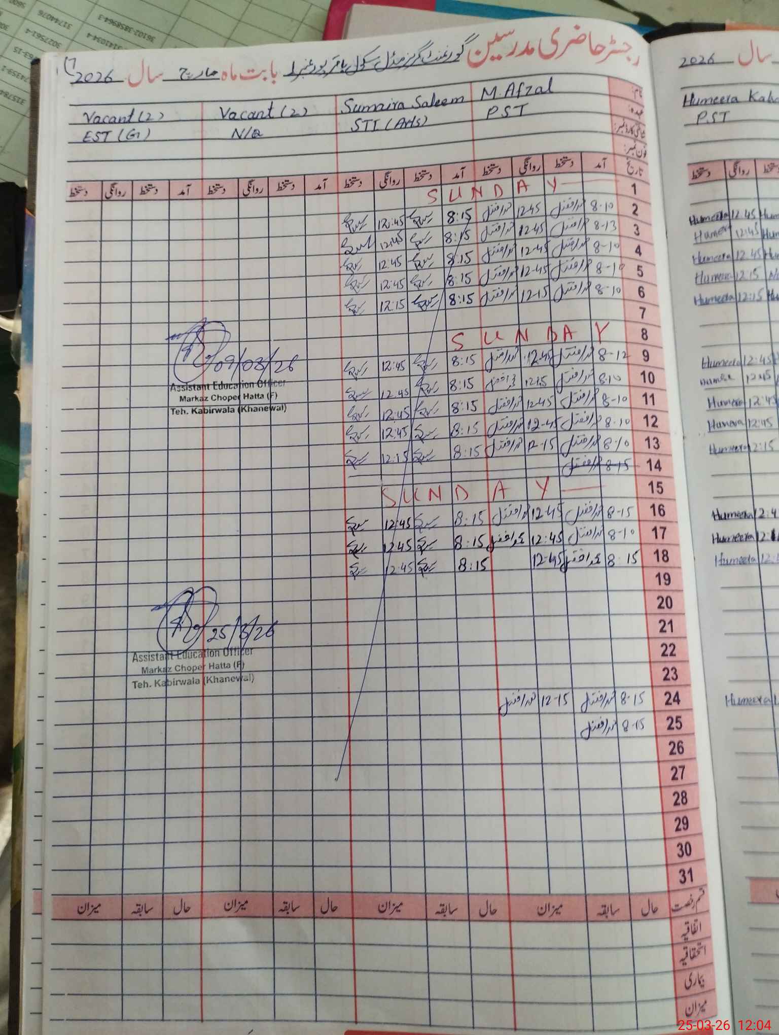 | District: KHANEWAL | Tehsil: KABIRWALA | Markaz: CHOPAR HATTA - FEMALE | Level: Middle | |